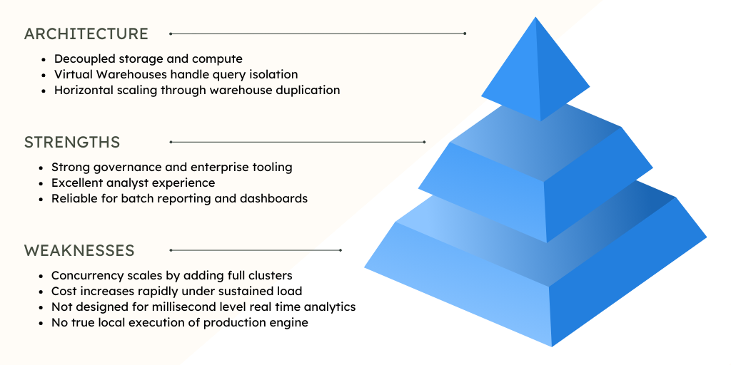 Snowflake transformed cloud warehousing by simplifying infrastructure and making BI accessible. It remains one of the most mature platforms for structured analytics and governance heavy environments. However, its scaling model reveals tradeoffs when workloads shift toward high concurrency or real time use cases.