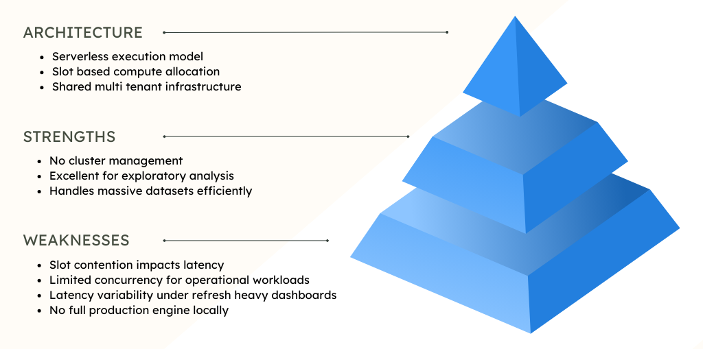 BigQuery abstracts infrastructure entirely. It is powerful for large-scale analytical queries and teams that prefer minimal operational overhead. The tradeoff emerges when consistency and concurrency become critical.