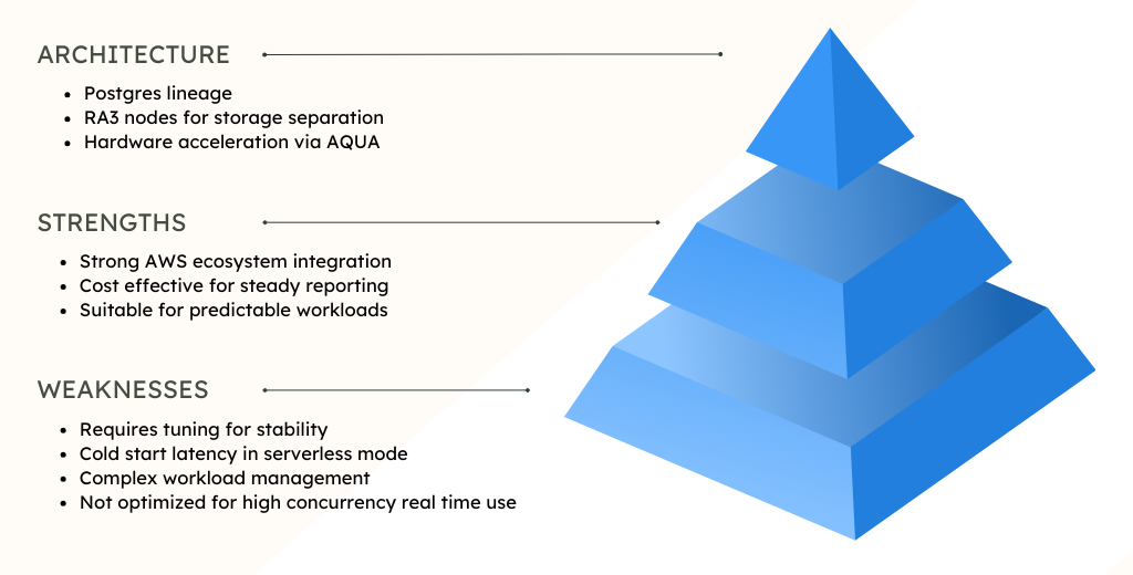 Redshift fits naturally within AWS centric environments. It has matured significantly, but it still reflects its legacy roots in how it behaves under performance pressure.