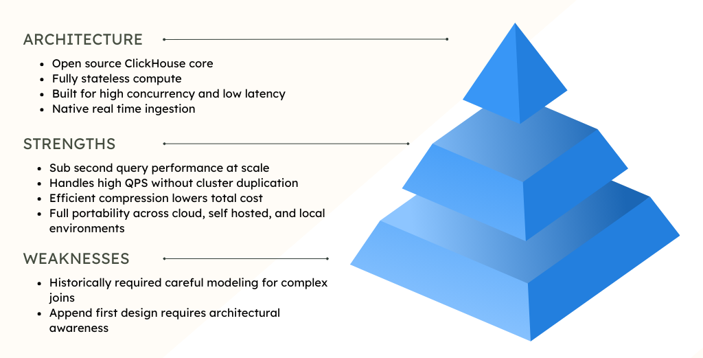 ClickHouse Cloud is fundamentally designed for real time analytics at scale. It does not treat high concurrency as an edge case. It is built around it. The open source foundation also changes the long term control equation.